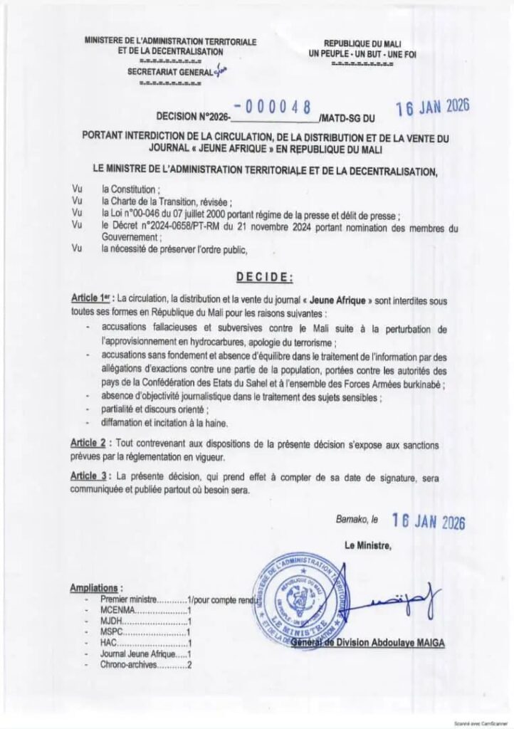 Le gouvernement du Mali à travers le ministère de l’administration territoriale a interdit le journal << Jeune Afrique >> sur toute l’étendue du territoire national. Les raisons évoquées sont dans ce document ci-dessous.